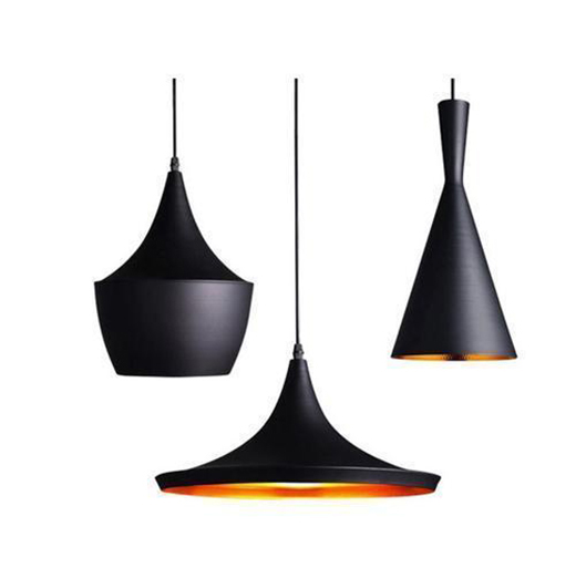 樂器吊燈是設(shè)計(jì)師從印度制作的黃銅容器獲得靈感設(shè)計(jì)而成,這種吊燈分為小號長錐型、大號寬廣型、中號飽滿型。以黑色燈罩居多,圓潤的亞光黑色表面與燈罩內(nèi)部的黃色組合,既神秘又熱情,令人感受到一種異域風(fēng)情。
