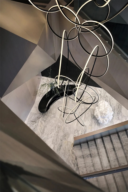 (環(huán)環(huán)相扣:圓與圓交疊,燈光與樓梯形成獨特藝術畫面。環(huán)環(huán)相扣賦予空間上下走動時的輕盈情緒和愉悅。明眾燈飾,定制非凡。)