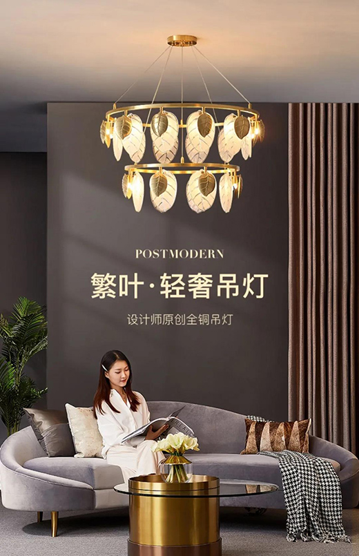選取樹葉的原型,融入黃銅的元素,做成一盞輕奢吊燈。喚醒大自然的原始生命力,仿佛置身于熱帶雨林的光影中。國標黃銅,質(zhì)感細膩。磨砂玻璃燈罩,透光明亮不刺眼。