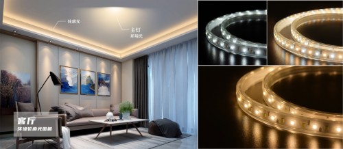 客廳作為一個家的核心區(qū)域,不同照明燈具組合也可以為客廳環(huán)境提供多種風(fēng)格上的變化。環(huán)境光+輪廓光的組合是比較常見的照明布局方式,環(huán)境光為客廳提供明亮的主光源,滿足會客、日常生活需要。同時(shí)輪廓光也可以在屋主休憩時(shí)提供較為輕松的低明度照明選擇,打造家庭的溫馨感。