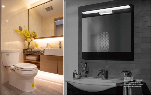 衛(wèi)生間雖小,燈光設(shè)置可是大有名堂。燈光設(shè)置不合理,在鏡子前人臉會出現(xiàn)陰影,不方便化妝、刮胡子等。避免這樣的情況,可在鏡前區(qū)增加鏡前照明,讓光源均勻打在臉上。鏡柜下方放置洗浴用品的位置,同樣可以增設(shè)燈帶。