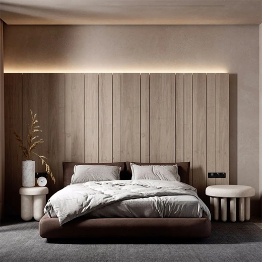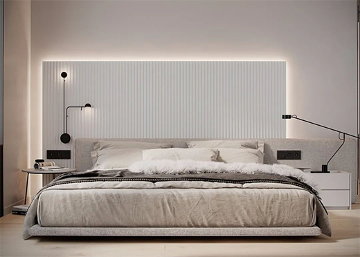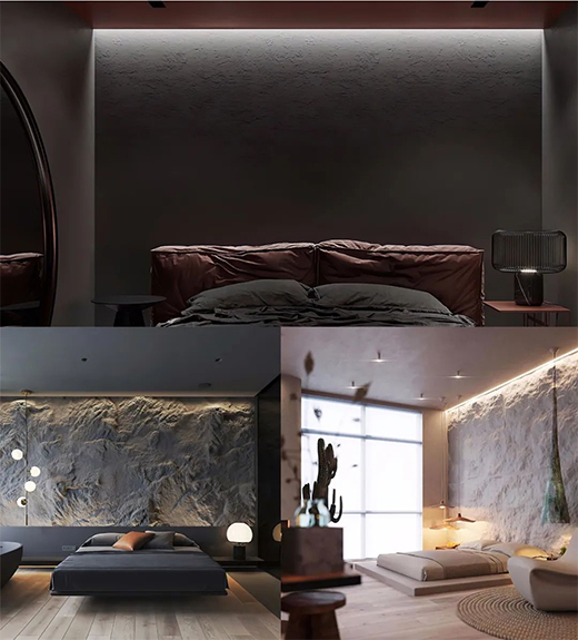 間接光不僅可以安裝在天花上,還可以在墻面使用,比如可以在 床靠背后設(shè)置往上照射的燈帶,搭配從上而下的射燈或者吊燈,可以產(chǎn)生豐富的光源層次,尤其是極簡風(fēng)格的臥室,墻面造型中可以大量使用燈帶或者燈條,來塑造墻面造型,照明也變成為了墻面裝飾的重要組成部分,并且成為了亮點(diǎn)。