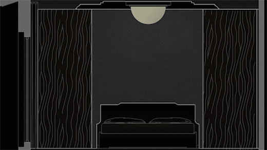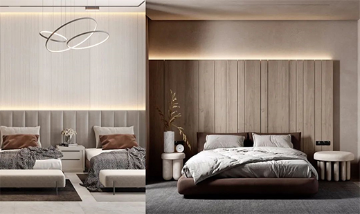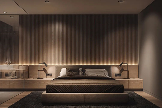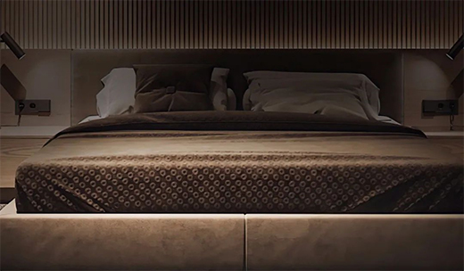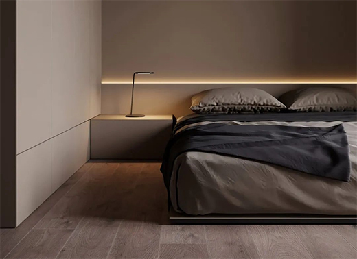 首先我們來看下床頭部分的照明設(shè)計(jì),床頭部分的照明分為兩個區(qū)域,一個是墻面床頭照明,另一個是床頭柜的照明,私宅空間中,枕頭部分需要光,但是不需要使用直接光進(jìn)行照明,如果有直接照明的射燈,很容易給人一種壓迫感,所以我們可以在床頭天花上方安裝洗墻燈帶。