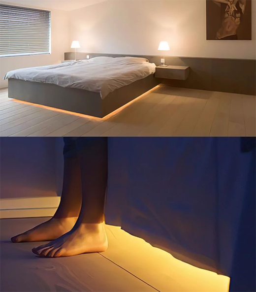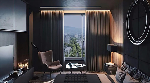 除了在床頭使用外,燈帶還可以作為睡眠燈,或者氛圍光來使用,比如說,我們在床下設(shè)置一盞超低照度和色溫的感應(yīng)燈帶,可以方便夜間使用,同時(shí)可以作為營造氣氛的睡眠燈,或者,在窗簾盒安裝燈帶,突出窗簾的造型感,營造空間的舒適感。