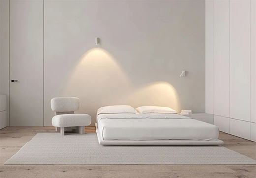 第二種使用射燈的照明方式在極簡的空間中,我們采用比較多的依然是射燈照射,射燈的使用最可能做成眩光問題,尤其在夜間使用的時(shí)候,所以使用射燈的時(shí)候,照明一定要避開枕頭方向。