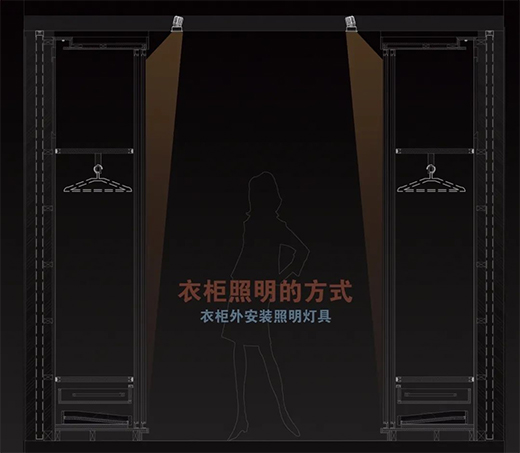 1)衣柜外安裝照明燈具的方式,如果采用衣柜外安裝方式的話,為了保證在柜門打開以后 ,我們可以無死角的去觀察衣柜內(nèi)的物品,建議選擇洗墻型的筒射燈來照射,這種燈具的位置距離柜子的寬度,保持大約是柜子高度的三分之一。