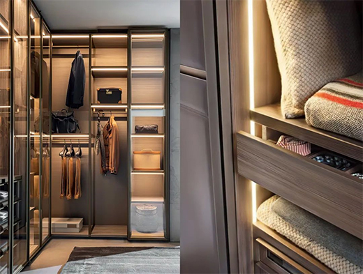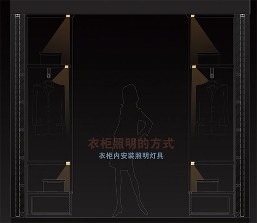 衣柜照明在臥室中還有一個需要重點(diǎn)照明的區(qū)域是衣柜區(qū)域,這邊的設(shè)計(jì)目的是,我們在選擇衣物時(shí),提供足夠的照明,并且很好的還原衣物的色彩,我們在處理儲存柜的照明時(shí)通常有兩種設(shè)計(jì)方式。