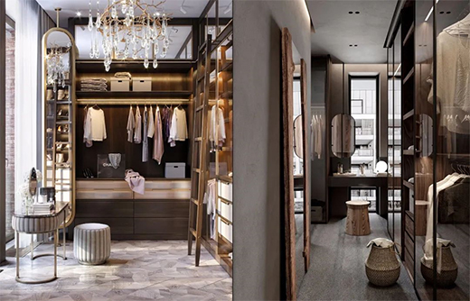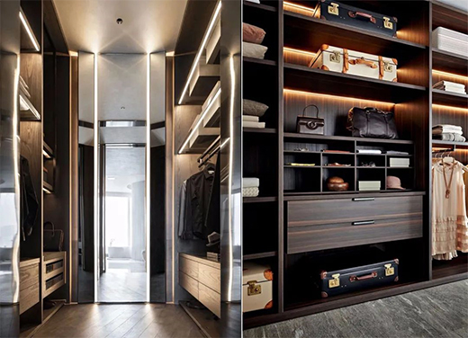 在一些大平層或別墅空間中,會有獨(dú)立的衣帽間設(shè)置,這種衣帽間的衣柜大部分是敞開式的,沒有柜門,在設(shè)計(jì)這種衣柜照明的時(shí)候,就不建議采用感應(yīng)式的燈具了,而是采用正常的天花燈具來提供照明。