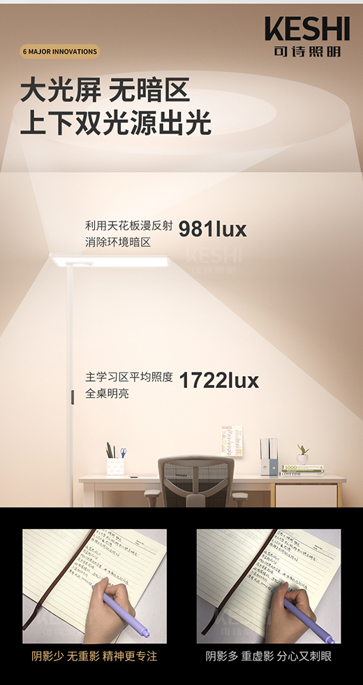 經(jīng)過測試,該燈具提供的照度能達(dá)到全桌明亮,其中上發(fā)光利用天花板的漫反射有效消除環(huán)境暗區(qū),如我們所見,雙光源出光讓書桌整體更光亮。