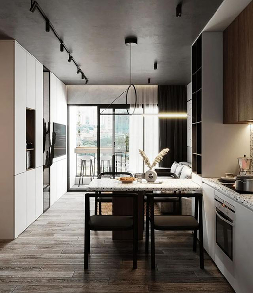 ▼ 餐廳除過(guò)極簡(jiǎn)一頭吊燈以外,配合明裝射燈進(jìn)行燈光點(diǎn)綴,滿足照明以外,還能讓空間增加層次。
