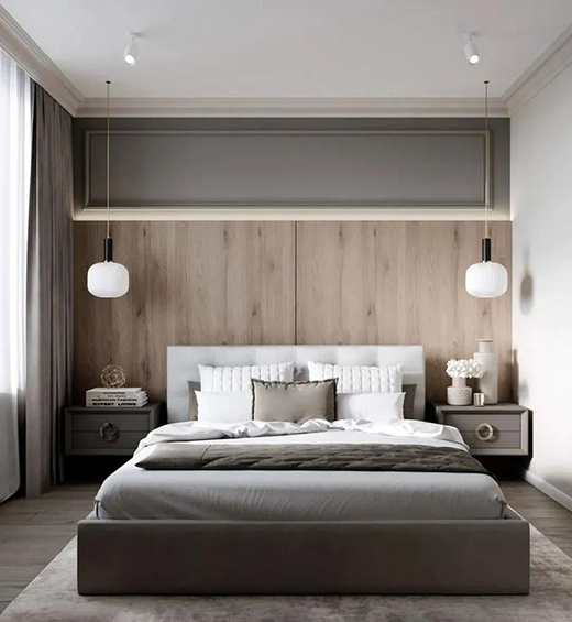 ▼ 臥室同樣無(wú)主燈設(shè)計(jì),四角明裝筒燈以及吊線燈輔助照明,增加空間層次,同時(shí)更時(shí)尚。