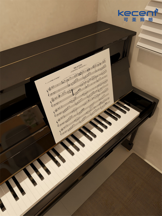 鋼琴區(qū)采用三盞防眩射燈(7W 36° 4000K)做洗墻照明,光弧清晰的小山丘打在墻上,增添了一份靈動感,讓人不禁想象著,那漂亮的小山丘就像是舞者的裙擺,它會隨著美妙的音符跳動起來,跳出動人的圓舞曲。