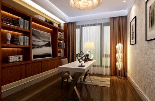 書房的環(huán)境應是文雅幽靜,簡潔明快。光線最好從左肩上端照射,或在書桌前方裝設亮度較高又不刺眼的臺燈。專用書房的臺燈,宜采用藝術臺燈,如旋壁式臺燈或調光藝術臺燈,使光線直接照射在書桌上。一般不需全面用光,為檢索方便可在書柜上設隱形燈。