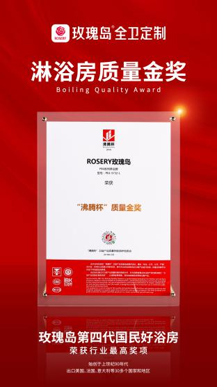 正因玫瑰島始終在質(zhì)量之路上悉心耕耘,保持了高質(zhì)量發(fā)展,玫瑰島第四代淋浴房PE4系列榮獲了“沸騰杯”質(zhì)量金獎和“標(biāo)桿耐用淋浴房”、“標(biāo)桿易潔淋浴房”質(zhì)量標(biāo)桿獎兩項大獎。