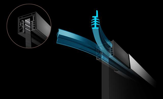市面上絕大多數(shù)窄邊框淋浴房側(cè)材寬度僅約2公分,側(cè)材折彎無加固處理,玻璃固定不到位,促使受力不均勻,玻璃極易脫出,發(fā)生危險。新品SU2側(cè)材、頂材、底材均有鋁芯加固采用反刺膠條,將玻璃牢鎖側(cè)材內(nèi),受力均勻不易脫出,安全后顧無憂。
