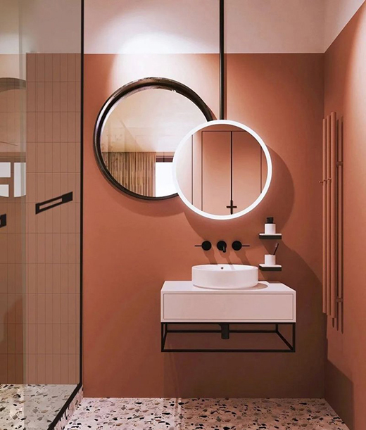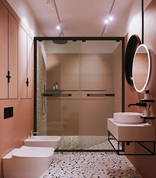 同時在淋浴區(qū)利用墻磚形成強(qiáng)烈對比,從視覺上進(jìn)行了干濕分區(qū),而暖色調(diào)的橘粉色墻面與碎花瓷磚的搭配,營造出甜美的公主風(fēng)浴室風(fēng)格。