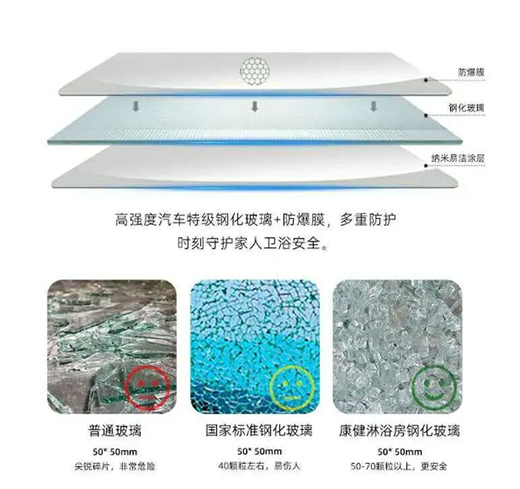康健衛(wèi)浴的3H金剛防爆膜采用的是精品透光材質(zhì),保證了玻璃受到強(qiáng)烈撞擊時(shí),爆裂物緊緊吸附在防爆膜上面,不會(huì)造成對(duì)人體的傷害。