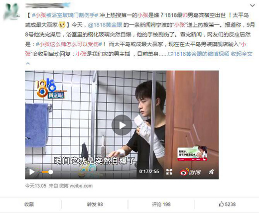 小張這么帥怎么可以受傷?看到這句話是不是一臉懵逼,小張是誰?他受什么傷了?這其實是1818黃金眼新聞里的主人公。報道稱,9月8號小張洗完澡后,浴室里的【鋼化玻璃】突然自爆,導(dǎo)致他的手被割傷了。而當看完新聞后,網(wǎng)友們的反應(yīng)居然是:“小張好帥,肯定不是他的錯”、“小張這么帥怎么可以受傷”、“物業(yè)快跟小張道歉”。