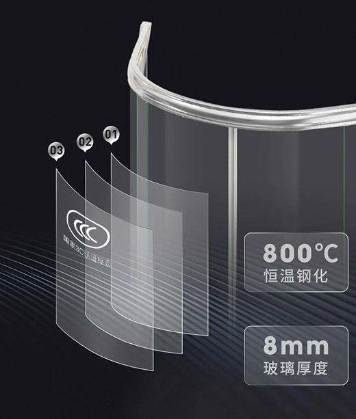 卡貝對安全問題從不敢大意,淋浴房采用了通過了國家3C認證的汽車級鋼化玻璃,由3層高溫真空夾膠玻璃組成。玻璃在800℃的恒溫下進行鋼化處理,厚度達到了8mm,安全性能非常出色。