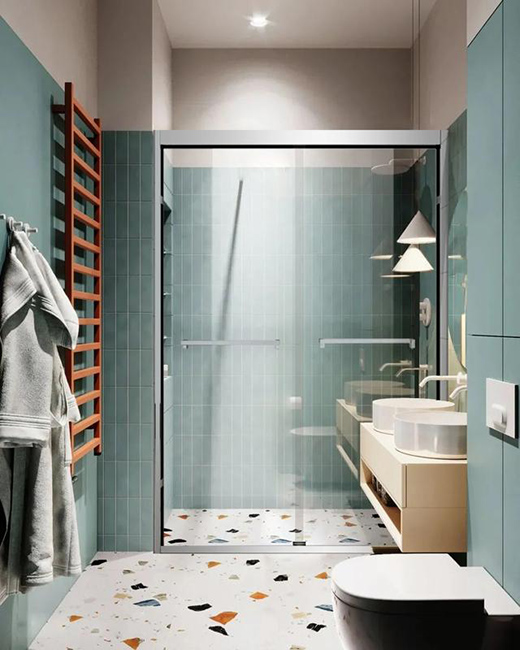 設(shè)計(jì)師選擇了登宇鏡光色淋浴房,搭配淡綠色空間,看起來(lái)時(shí)尚小清新。同時(shí)登宇淋浴房移門設(shè)計(jì),不占用空間的同時(shí),有效改善浴室潮濕問(wèn)題,阻隔沐浴時(shí)水花打濕干區(qū)。