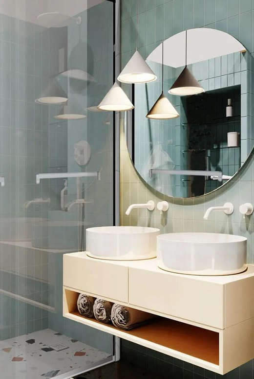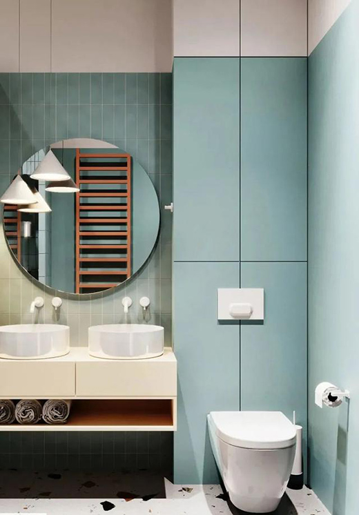 設(shè)計(jì)師選用雙臺(tái)洗漱柜,搭配時(shí)尚圓形鏡子,精致調(diào)皮,不僅可以滿足家人的洗漱而且充分利用墻面,壁龕置物格設(shè)計(jì),收納空間也是棒棒噠。