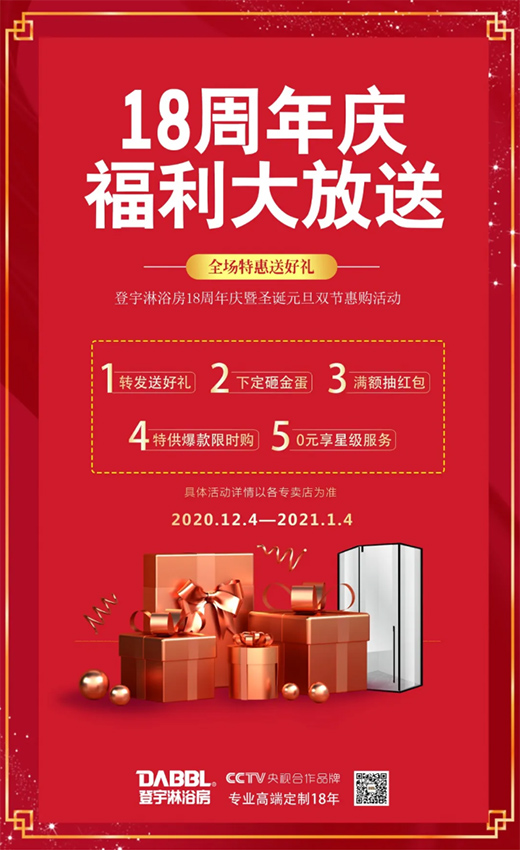 為回饋多年來(lái)新老客戶的信任與支持,2020年12月4日-2021年1月4日,登宇淋浴房18周年慶暨圣誕元旦雙節(jié)惠購(gòu)活動(dòng)盛大開啟,為消費(fèi)者帶來(lái)高品質(zhì)的消費(fèi)盛宴。