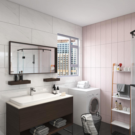 設計師別出心裁地將背景墻瓷磚換成石蕊紅,搭配SA2的高顏值更加體現出低調雅致;淋浴房落定后,其他浴具的擺放位置便有了參考,設計師在旁邊配置了浴巾掛鉤,而簡易置物架則放置在淋浴房和洗衣機之間,方便取用。