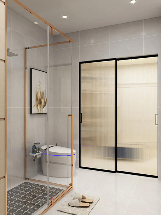 ▲入門選擇了極窄雅黑邊框+超白長虹玻璃的M1A全景門,朦朧感的玻璃既保護(hù)了隱私,又增加了空間的美感,讓浴室生活變得趣味十足。
