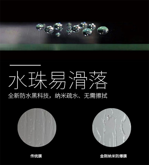 作為第二道安全保險,淋浴房附有一層金剛納米防爆膜讓整個表面如同金剛石般堅硬,另外,相較于傳統(tǒng)普通膜而言,金剛納米防爆膜水過而不留痕跡,減少水漬和污垢積存。