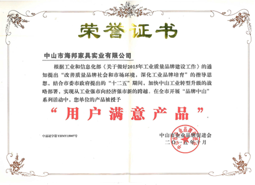 圍繞著工業(yè)和信息化部《關(guān)于做好2015年工業(yè)質(zhì)量品牌建設(shè)工作》的通知所提出“改善質(zhì)量品牌社會(huì)和市場環(huán)境,深化工業(yè)品牌培育”的指導(dǎo)思想,中山市企業(yè)品牌促進(jìn)會(huì)在全市開展了“品牌中山”系列活動(dòng),其中中山市海邦家具實(shí)業(yè)有限公司被授予“用戶滿意產(chǎn)品”稱號(hào)。