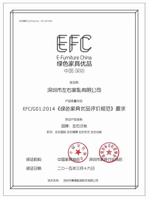 綠色優(yōu)品,是幸福的底線早在2015年,左右沙發(fā)便成為首批獲得“中國(guó)綠色家具優(yōu)品”認(rèn)證的四家企業(yè)之一,也是唯一一家沙發(fā)品牌。