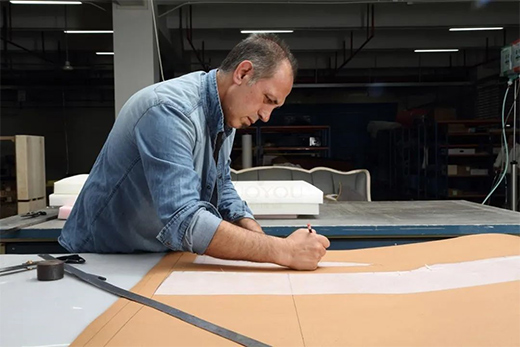 沙發(fā)框架開始制作之前,先由豐富經(jīng)驗的師傅1:1畫好版式圖樣,還需要進行精細的計算,以確保各個構件之間的連接點緊密結合、互相支撐。