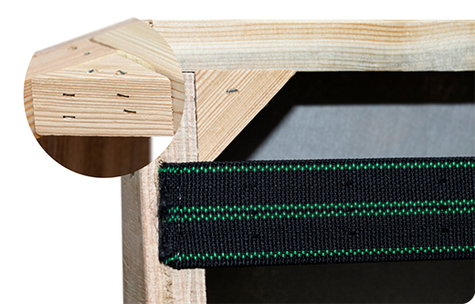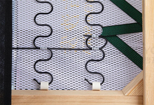 為改善這一使用細節(jié),左右選用高強度耐磨材質的塑膠碼仔,按固定打釘要求,碼仔內邊與木方緊密貼合,保證了蛇形彈簧不會脫落,長時間承重也不會產(chǎn)生異響~