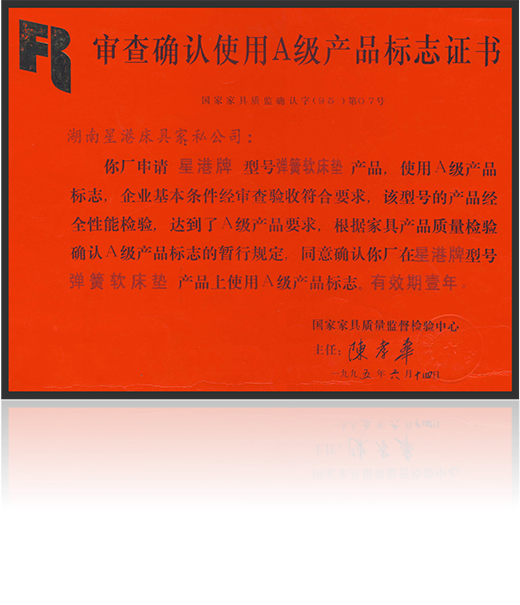 - 星港家居獲1987年度“國(guó)家家居檢測(cè)中心A級(jí)產(chǎn)品證書(shū)” - 2022/05/16
