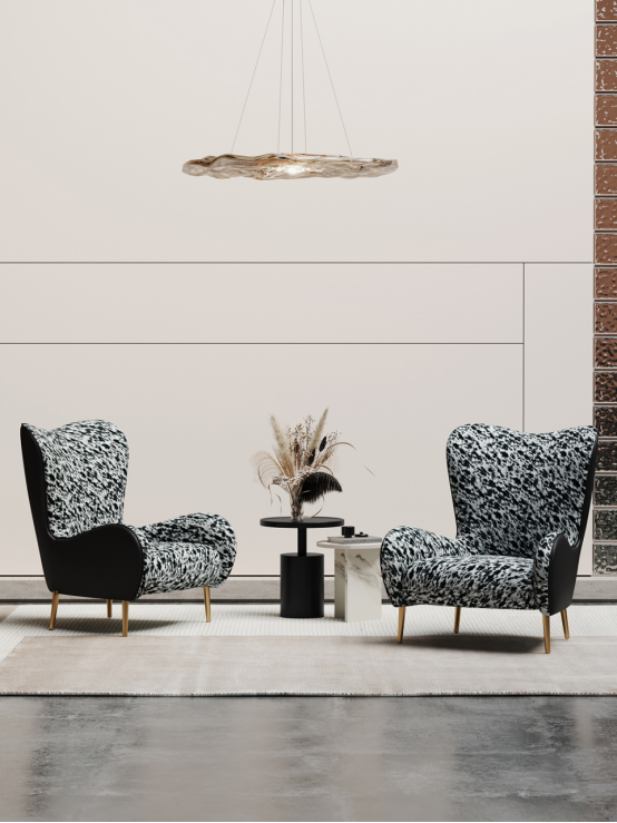 洛品有家參考安妮女王時(shí)期最具有代表性的安樂椅,并在此基礎(chǔ)上作出創(chuàng)新。這款休閑椅靠背與扶手相連,采用極繁主義的黑白印花,體現(xiàn)出洛品有家品牌深處的“輕柔嫵媚”。輕巧的腿,高高的靠背,兩側(cè)填翼并向前略略延伸,如女性的劉海和發(fā)冠,整體流暢舒適優(yōu)雅。
