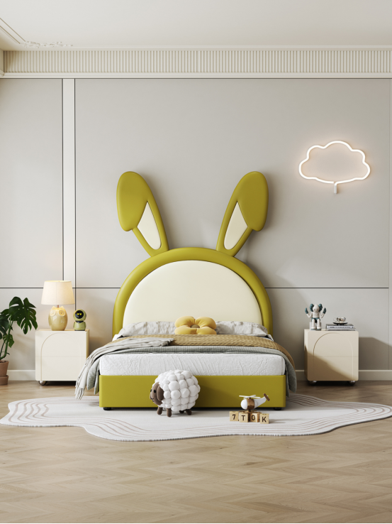 兔耳朵造型軟體床很適合放在兒童房,活潑可愛(ài),簡(jiǎn)約的設(shè)計(jì),不添加累贅,讓人一眼看去就覺(jué)得舒適自然。加上卡通玩具的布置,充分體現(xiàn)了兒童天真活潑的特點(diǎn)。