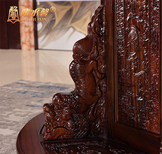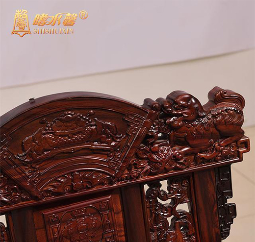 座椅靠背中間雕刻一只雄獅腳踏祥云目光如炬,直視前方,寓意為權(quán)勢(shì)、高貴、尊榮的象征,又是幸運(yùn)與成功的標(biāo)志。"祥云"則寓意著吉祥如意,順心如意。合在一起則為升官發(fā)財(cái),吉祥如意。