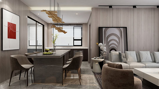 沒有使用奢侈絢爛的飾品裝飾,而是使用有藝術(shù)感的飾品及燈飾,點(diǎn)綴以少量金色金屬質(zhì)感,提升空間檔次同時(shí)又低調(diào)內(nèi)斂。