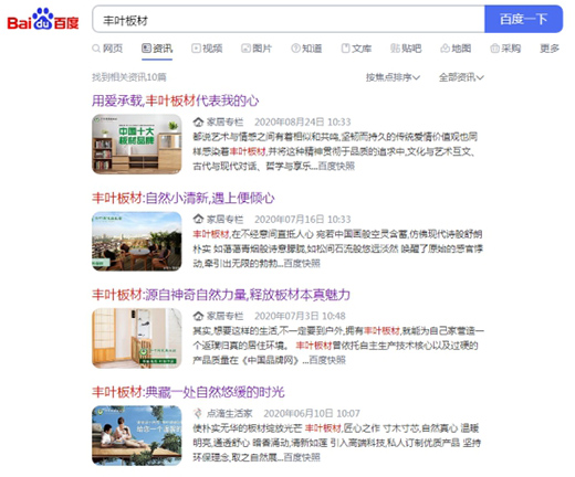 再則,我們還可通過瀏覽百度圖片、知道、文庫、貼吧等板塊的搜索結(jié)果,對豐葉板材形成一個全面、立體的認知,深刻體會這個中國板材品牌的健康環(huán)保魅力。