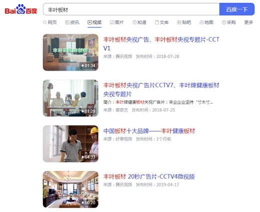 在閱讀過文字版的報道后,我們不妨再通過視頻版展示來進一步了解豐葉板材。在視頻板塊的搜索結(jié)果中,我們看到了愛奇藝、優(yōu)酷、騰訊視頻、好看視頻等數(shù)十家人氣視頻網(wǎng)站的熟悉身影,可見豐葉板材已與這些流量型平臺達成了戰(zhàn)略合作,以視聽結(jié)合的方式為自身的品牌廣告片推廣奠定下高覆蓋性傳播的基礎(chǔ)。