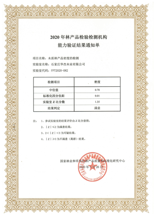 近日,石家莊華杰木業(yè)有限公司研發(fā)中心通過了國家林草局林產品質量和標準化研究中心組織的人造板甲醛釋放量測試、吸水厚度膨脹率、木制林產品密度等人造板相關項目檢測能力驗證活動,檢測結果均符合相關要求。