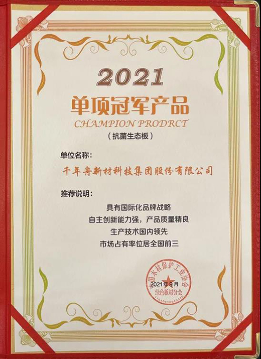 本次大會公布了中國木材保護工業(yè)協(xié)會十周年風(fēng)云人物獎及單項冠軍產(chǎn)品獎。其中,千年舟集團副總裁田茂華榮獲中國木材保護工業(yè)協(xié)會十周年風(fēng)云人物獎;千年舟旗下「抗菌生態(tài)板」斬獲單項冠軍產(chǎn)品!