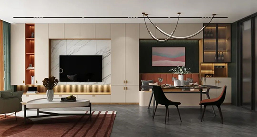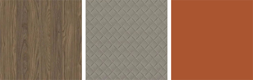 家居色彩可為浪漫點綴。北美深胡桃與菱形象灰皮紋搭配,自然柔和。細雨橘橙的活力,打破了空間的寧靜,使空間洋溢著喜悅和活潑的氛圍,以明快的色彩點綴情侶幸福愉悅的時光。