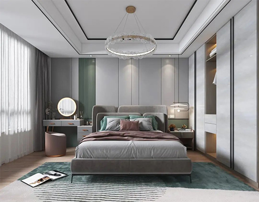 《醉曲風荷》主臥梳妝鏡配備觸摸式照明開關(guān),簡潔便利,搭配金屬腳的設(shè)計使產(chǎn)品更加時尚。左右對稱式衣柜設(shè)計,滿足情侶分區(qū)使用。