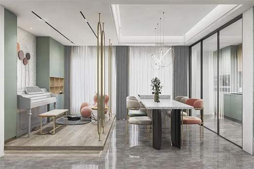 準備一桌親手做的飯菜,彈一首動人心弦的歌?!逗喚印返牟蛷d整體為一個多功能休閑區(qū),鋼琴區(qū)與餐廳互通。一邊是時光悠悠,你彈我唱,一邊是柴米油煙,細水長流,詮釋了愛情最好的模樣。