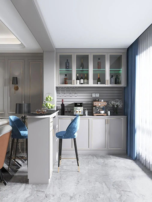 香薰美酒最宜呢喃訴情?!栋茽枹颉反斑呍O(shè)有吧臺,休閑之時可在吧臺邊小酌暢談??ㄗ戏脚渲密泬|,增加卡座舒適度,兩側(cè)大玻璃窗增加采光率,掛有窗簾避免陽光暴曬。情人節(jié)和TA坐在陽臺上,調(diào)制一杯酒,看著窗外風景,講講最近的趣事。