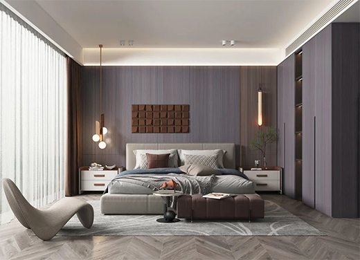 雁行意木深色肅雅,紋理爽直,深淺過渡勻而不亂。將細(xì)密折線藤紋隱于科技木間隙,如天際風(fēng)云疏雅,又如雁陣成列而飛。遠(yuǎn)觀大氣沉穩(wěn),近看秀雅工整,帶著些領(lǐng)頭雁式的端方持重。