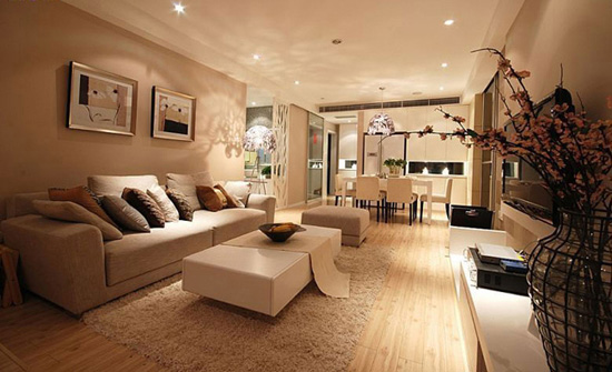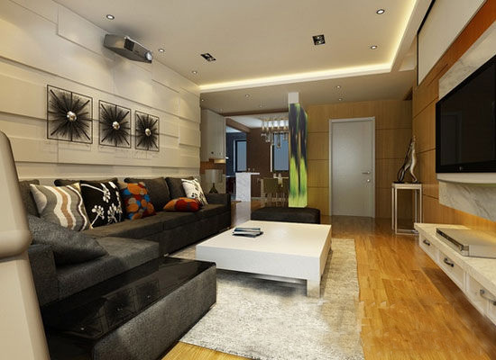 復(fù)式格局的空間多選用現(xiàn)代風(fēng)格設(shè)計(jì),可以帶來(lái)空間的明朗純粹之感,極具味道,就如同這款客廳地板圖片中一樣,首先選用黑色木地板和淺灰色的布藝沙發(fā)奠定了主體基調(diào),搭配米色皮毛觸感的地毯,柔軟精致。