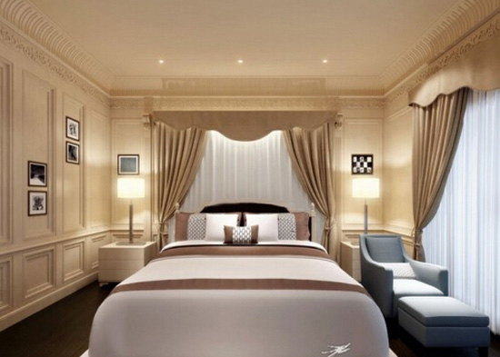 這款有著濃濃的英倫風(fēng)情,吊燈采用了別致的圓形,而黑白不規(guī)則地毯是英倫風(fēng)格臥室不可或缺的搭配,配合上黑色軟質(zhì)床品和深色地板,整間臥室溫暖又溫馨。而床背不脫離奢美的英倫皇室風(fēng),加上銀灰亮的窗簾更顯大氣。