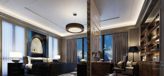 點(diǎn)與面之間互相呼應(yīng),灰色窗簾與黑色地毯,黑色的床與灰色木地板,色調(diào)雖然濃重,點(diǎn)綴以細(xì)節(jié)處的金色,大氣現(xiàn)代質(zhì)感凸顯。